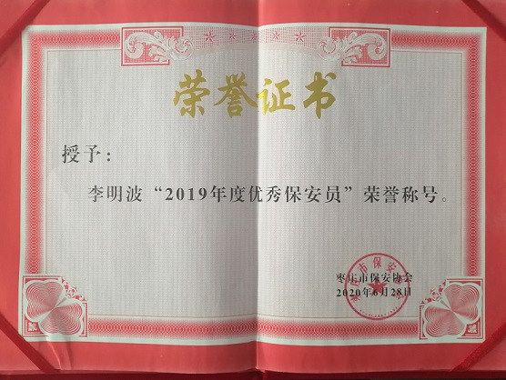 因“疫情影响”,2019度优秀保安队员表彰大会暨第四届枣庄市保安协会换届大会,于2020年8月26日,在枣庄金尊大酒店隆重举行,我司保安队员李明波同志被枣庄市保安协会授予“2019年度优秀保安队员”荣誉称号!